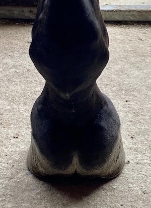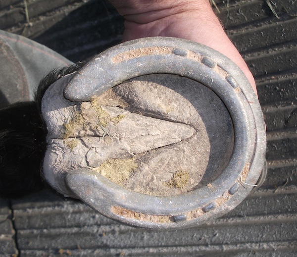 Here is the same mare four months apart, shod compared to barefoot. The spread of the hoof is shocking! Heels are supposed to be wide and supportive for the entire foot and leg of the horse. Photos courtesy of Martí Sala Bayés, a European farrier who endorses barefoot, as much as possible, for hoof health. He is also an eventing rider himself, and was the official farrier for the 1992 Barcelona Olympics. He is now asking the sporthorse world to consider utilizing barefoot as a tool to aid in creating better hoof health, even for the elite shod horses of upper level performance. He calls this, “Interval Barefoot.”