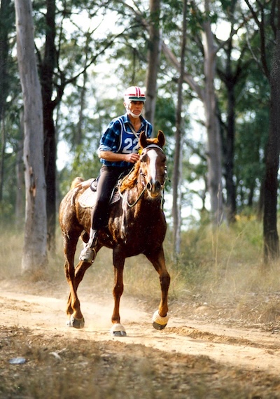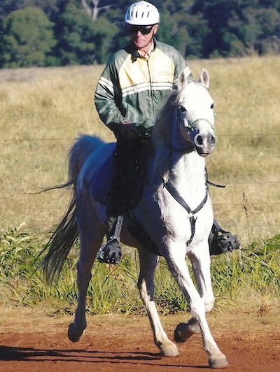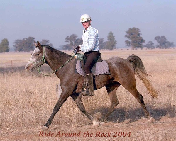 Dr Steven Roberts competing barefoot and bitless on Arabian gelding Bendy Creek Arrival, who was 5 years old at that time, doing a 40km training ride at a place called The Rock in 2004. Dr Roberts bred him.